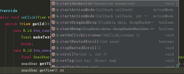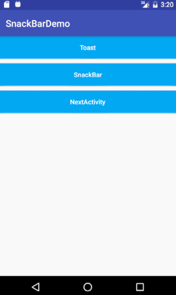 //Toast Toast.makeText(this, "Click the Toast", Toast.LENGTH_SHORT).show(); //Snackbar /** * @param view The view to find a parent from. * @param text The text to show. Can be formatted text. * @param duration How long to display the message. */ Snackbar.make(mSnackBar, "Click the SnackBar", Snackbar.LENGTH_SHORT).show();