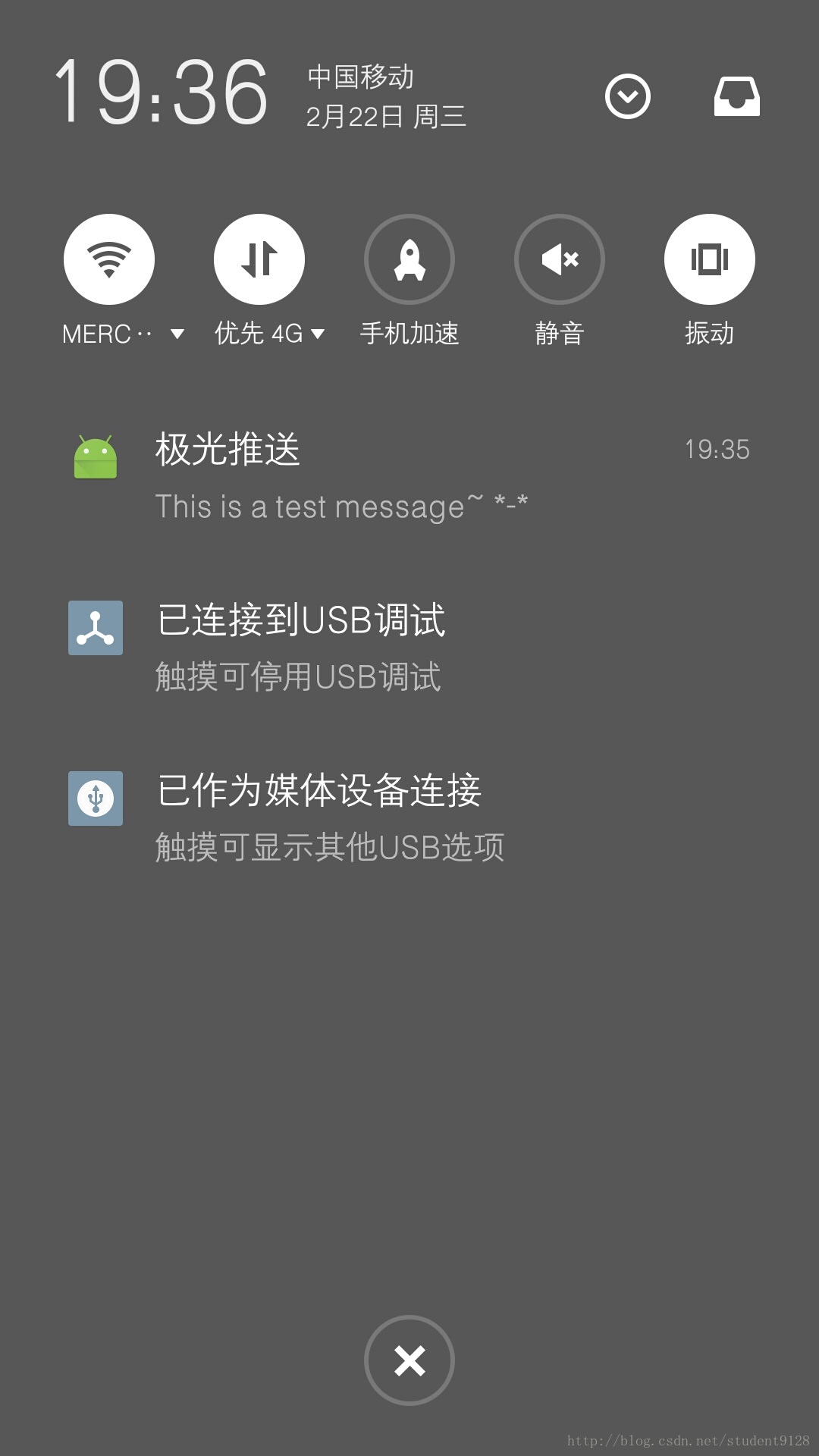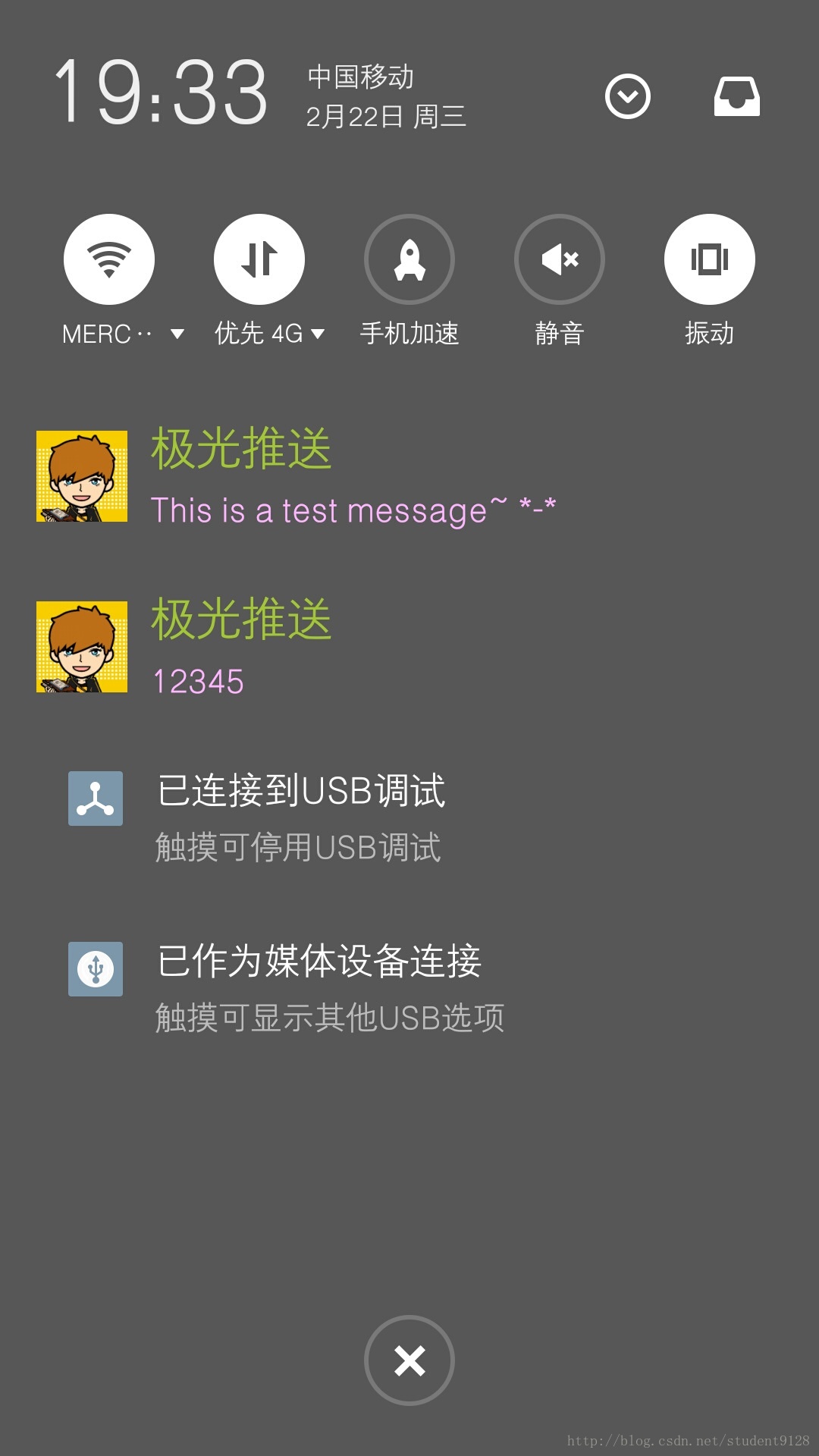 注意:通过对比可以发现,自定义样式的通知栏没有时间,默认的是有时间的(信鸽推送自定义的是有时间的,这一点我喜欢信鸽的,其他效果反正都一样,何必给自己找trouble)。