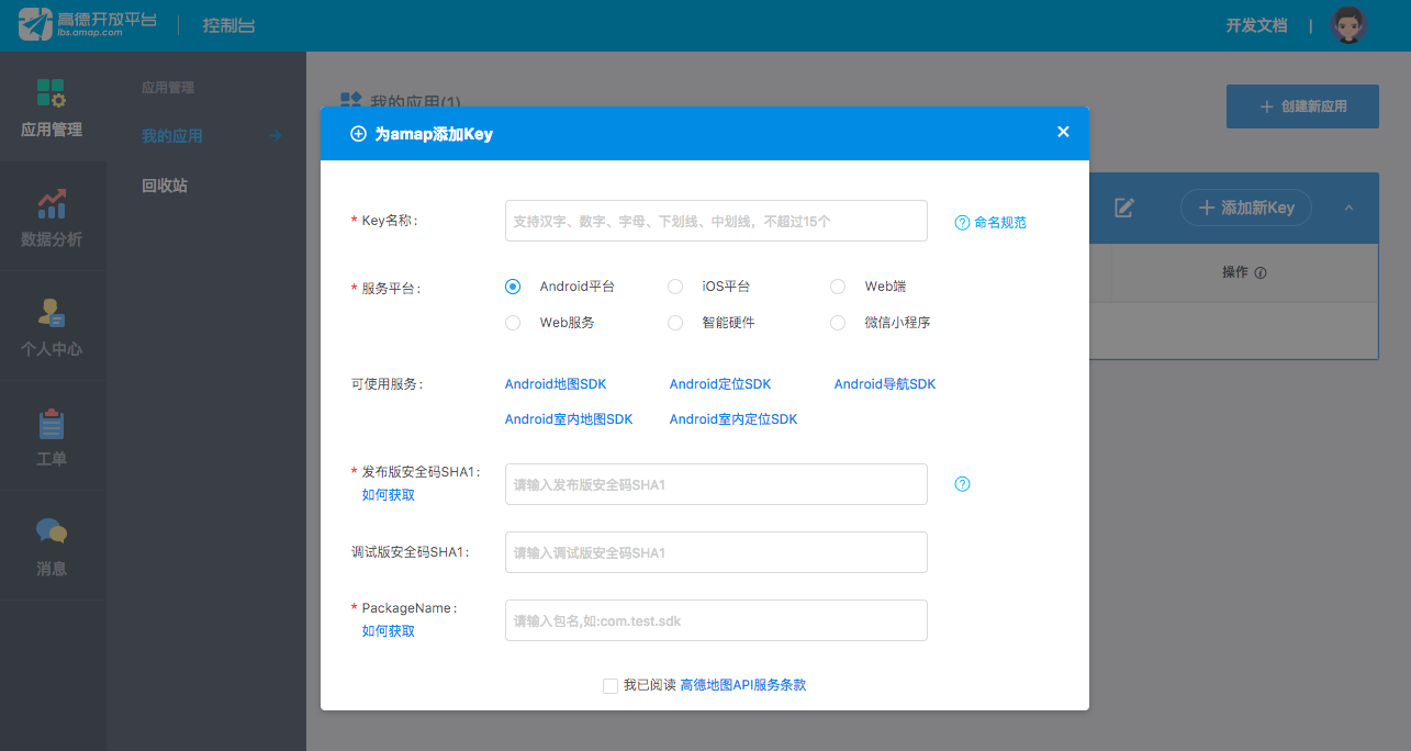 注意:这里要提醒一点是,申请key的时候如果只填写了发布版是SHA1值,个人建议在Gradle中添加下面的代码,可以在debug中正常使用key